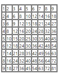 <!DOCTYPE html> <html> <head> <meta charset="UTF-8"> <title>Insert title here</title> <link rel="stylesheet" href="../css/outStyle.css"> <style> table, td { border:1px solid black; } </style> </head> <script> document.write("<h1>구구단표</h1>"); document.write("<table>"); for (var i = 1; i <= 9; i++) { document.write("<tr>"); document.write("<td>" + i + "</td>"); for (var j = 2; j <= 9; j++) { document.write("<td>" + i * j + "</td>"); } document.write("</tr>"); } document.write("</table>"); </script> <body> </body> </html>