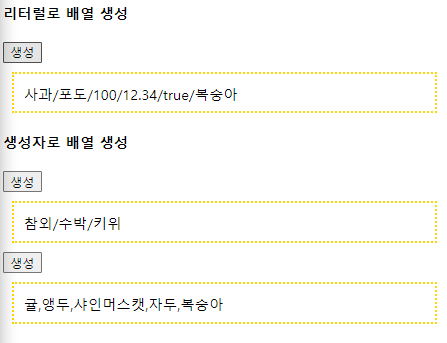 <!DOCTYPE html> <html> <head> <meta charset="UTF-8"> <title>Insert title here</title> <link rel="stylesheet" href="../css/outStyle.css"> <style> div { border: 3px dotted gold; height: 20px; margin: 10px; padding: 10px; } </style> </head> <body> <script src="../js/array.js"></script> <h4>리터럴로 배열 생성</h4> <input type="button" value="생성" onclick="proc1()"> <br> <div id="d1"></div> <h4>생성자로 배열 생성</h4> <input type="button" value="생성" onclick="proc2()"> <br> <div id="d2"></div> <input type="button" value="생성" onclick="proc3()"> <br> <div id="d3"></div> </body> </html><array.js>